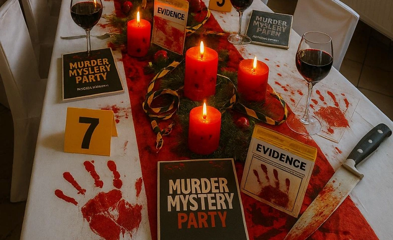 War es der Gärtner oder doch die trauernde Witwe? Dieser Frage geht Ihr beim Lunch mit Gänge-Menü nach. In Gruppen von jeweils 6 Personen schlüpft Ihr in vorgegebene Rollen und spielt diese mit Hilfe eines Drehbuchs, in dem Ihr die Dialoge und auch nützliche Hinweise zur Ergreifung des Mörders findet.