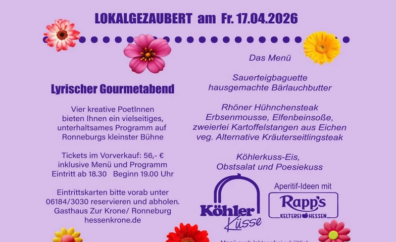 Der Abend wird mit freundlicher Unterstützung der lokalen Unternehmen Köhler Küsse und der Rapp’s Kelterei gestaltet. Die Gäste dürfen sich auf besondere kulinarische Kreationen freuen, bei denen die lokalen Schaumküsse und Fruchtsäfte auf kreative Weise präsentiert und ins Menü integriert werden. Die Gäste dürfen sich somit auf ein besonderes regionales 3-Gänge-Menü freuen, das das Thema „Lokalgezaubert“ auf überraschende und kreative Weise interpretiert. Tickets sind im Vorverkauf im Gasthaus „Zur Krone“ in Ronneburg-Hüttengesäß oder unter 06184 3030 erhältlich.