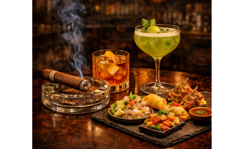 Freu dich auf ausgewählte Zigarren, perfekt abgestimmt auf zwei besondere Cocktails, die mit Tiefe, Wärme und Raffinesse überzeugen. Dazu servieren wir peruanisches Fingerfood, inspiriert von der Vielfalt und Seele Südamerikas – aromatisch, überraschend und ideal zum Teilen.