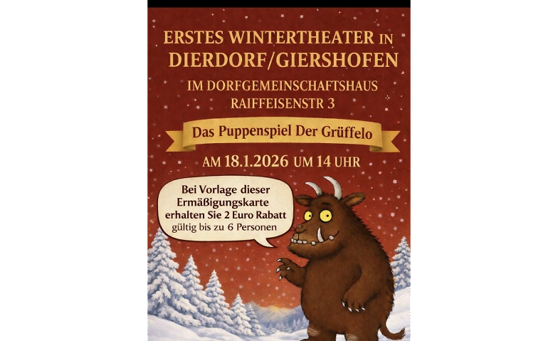 Am sonntag den 18.1.2026 kommt die pupoenbühne land der lichter  nach Dierdorf-Giershofen ins dorfgemeinschaftshaus   und bringen das welt  bekannte kindervuch von Julia donaldson und Axel scheffler der Grüffelo auf die bühne  wir lassen den grüffelo zum leben erwecken  ein puppenspiel für fie ganze familie  unsere vorstellung findet am sonntag den 18.1.2026 um 14 uhr statt ein spaß für groß und klein