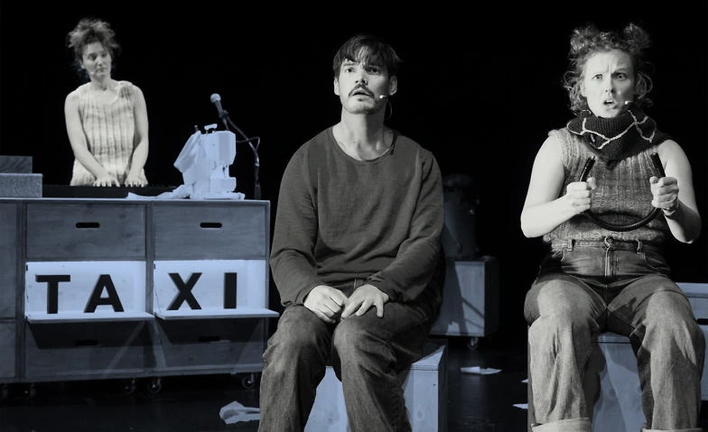 Es geht um Taxis, die sich verwandeln; um Taxifahrer, die eine seltsame Sprache sprechen; und es geht um Taxifahrten mit einer Giraffe, zu Piraten oder sogar auf den Mond. Die drei Darsteller*innen und Musiker*innen erzählen, singen, spielen, wechseln Spuren und Rollen, hantieren an Maschinchen, Schildchen und Instrumenten und atmen erst durch, wenn das Taxi unter grossem Applaus am Ziel ankommt. Einsteigen und anschnallen!