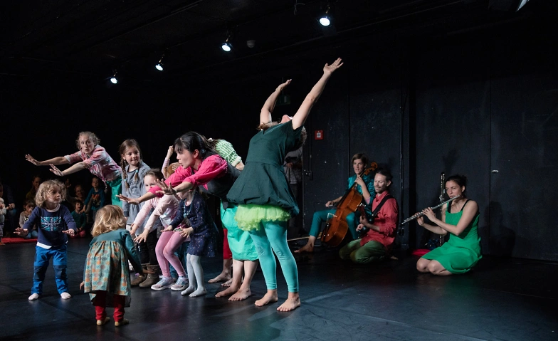 Durch Improvisation gestalten Tänzer:innen und Musiker:innen ein lebendiges Stück, das sich von einer Aufführung zu einer musikalisch-tänzerischen Spielwiese entwickelt. Die Kinder schauen zu, folgen ihrer Neugier und gestalten gemeinsam mit den Performer:innen spielerisch ihre eigene Welt.