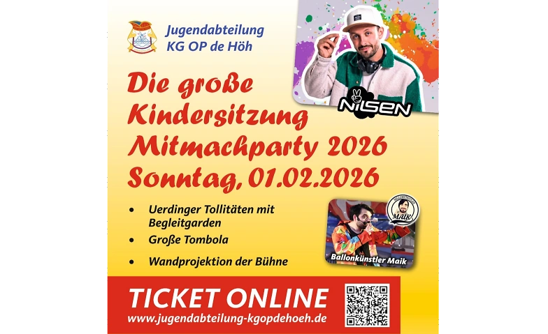 Freut euch auf ein buntes, fröhliches Karnevalsprogramm speziell für Kinder und Familien. Ein besonderes Highlight ist der Auftritt von Kindersänger Nilsen, bekannt aus KiKA, Super RTL und von zahlreichen Kinderfesten und Karnevalsveranstaltungen in ganz Deutschland. Mit seinen beliebten Mitmach-Songs sorgt er für ausgelassene Stimmung und begeistert Kinder wie Erwachsene zum Mitsingen und Tanzen.