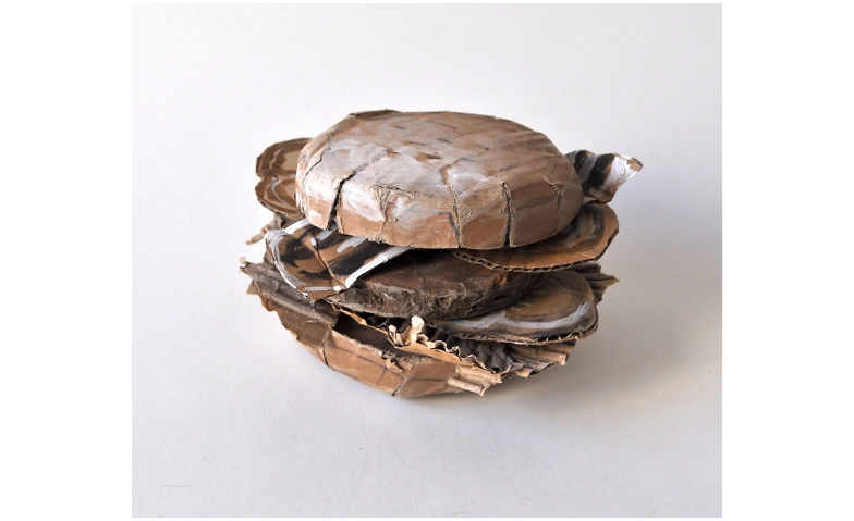 Credits: Nicolas Bernière, Le burger, 2025, Karton, Leim und Acryl, 15 x15 x10 cm