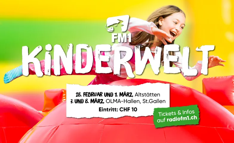 FM1 Kinderwelt Altstätten Samstag | Saturday, 28.02.2026, 10:00 | Schöntalhalle, 9450 Altstätten, CH | Tickets | |