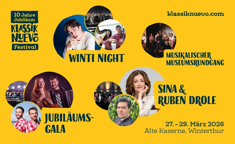Am Sonntagnachmittag lädt Klassik Nuevo zu einem besonderen musikalischen Rundgang ein. Nach einem gemeinsamen Eröffnungskonzert in der Alten Kaserne teilt sich das Publikum in drei Gruppen auf und wird zum Münzkabinett, ins Naturmuseum und ins Gewerbemuseum geführt. Dort erklingen kurze Live-Konzerte im intimen Rahmen mit ausgewählten Mitgliedern des Klassik Nuevo Orchestra, jeweils abgestimmt auf die Atmosphäre und den Charakter des Museums. Der Rundgang endet für alle mit einem gemeinsamen musikalischen Finale in der Alten Kaserne.