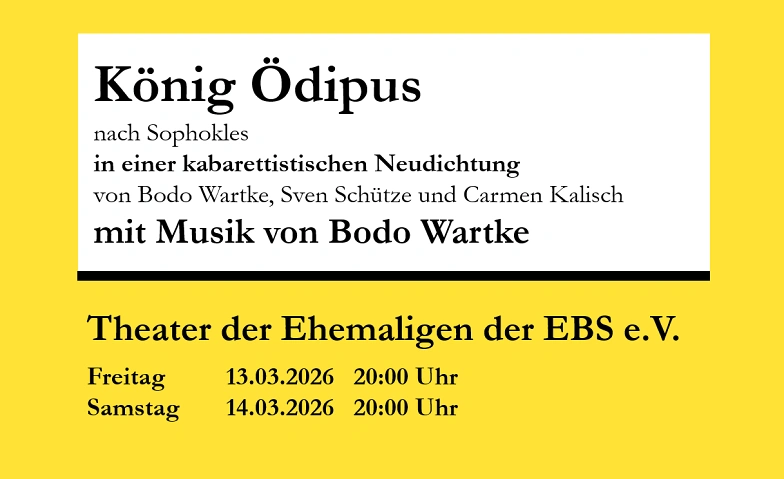 Wer schon immer einmal den tragischen Inhalt der griechischen Tragödie König Ödipus richtig verstehen wollte, ist hier genau richtig. In einer trotz des tragischen Inhaltes unterhaltsamen Neudichtung des Wortakrobaten Bodo Wartke bringt das Theater der Ehemaligen der EBS das von Bodo Wartke, Sven Schütze und Carmen Kalisch als Solostück gekonnt inszenierte Theaterstück in einer Version mit vier Personen auf die Dittchenbühne.