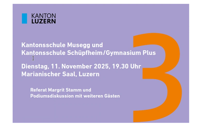 Der Eintritt ist frei, eine Online-Teilnahme ist möglich. Der Zugangslink wird vorgängig versandt und ist auf der Webseite der Kantonsschule Musegg und der Kantonsschule Schüpfheim aufgeschaltet.