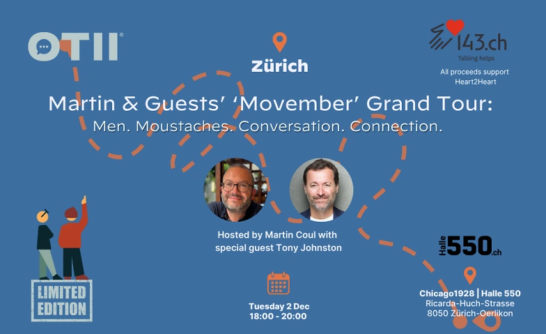 This Movember, Martin Coul brings his Grand Tour to Zürich for an evening of open dialogue on men’s mental health. Drawing on his own lived experiences, he focuses on tackling the conversations many shy away from, helping organisations and individuals address the root causes of poor well-being across all stages of life. He is also the host of The Hushed®, a podcast about men, stories, and what we don’t always say.
