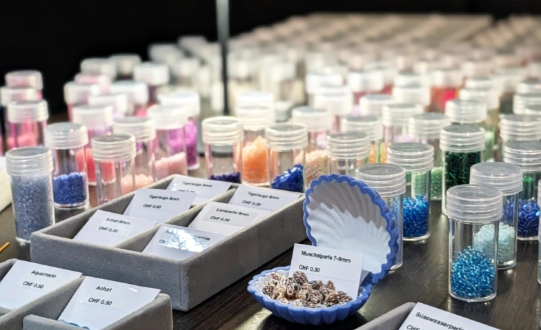 In entspannter und gemütlicher Atmosphäre kannst du deiner Kreativität freien Lauf lassen und deinen ganz persönlichen Schmuck gestalten. Ob Halsketten, Armbänder, Fussketten, Ringe, Brillenketten oder Schlüsselanhänger - du entscheidest, was entsteht. Wähle aus einer Vielzahl an Perlen und kreiere dein individuelles Lieblingsstück, ganz nach deinem Stil.