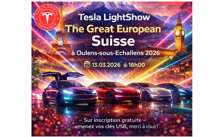 Ne manquez pas la Sortie Tesla LightShow “The Great European Switzerland 2026” à Oulens-sous-Echallens !