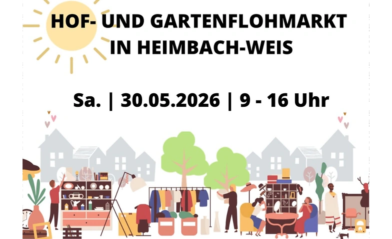 🏘️ Der Hof- & Gartenflohmarkt in Heimbach-Weis findet am 30.05.2026 von 9 bis 16 Uhr statt. Ergreift die Chance zum Verkaufen, Bummeln und Entdecken. Nutzt diese Gelegenheit um alte Schätze loszuwerden, oder neue zu finden.