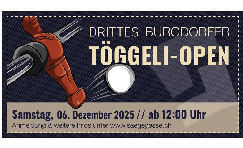 Nach dem grossen Erfolg der ersten beiden Turniere, gehen wir im 2025 in die dritte Runde. Zeigt euer Können am Töggeli-Kasten und messt euch mit 23 anderen Teams. Dem Sieger winken neben Ruhm und Ehre tolle Preise und die charmante Sägegass-Atmosphäre.
