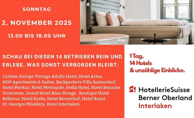 Am Sonntag, 2. November 2025 öffnen 14 Interlakner Hotels unter dem Motto «Hereinspaziert» ihre Türen und lassen Interessierte, Nachbarn, Partner und Einheimische in die Zimmer und hinter die Kulissen blicken. Nebst der Möglichkeit, die Hotels in Interlaken besser kennenzulernen, ist dieser Nachmittag dem gegenseitigen Austausch, dem Kennenlernen von Lehrstellen und dem Dankeschön der Hotellerie an Nachbarn und Einheimische gewidmet.