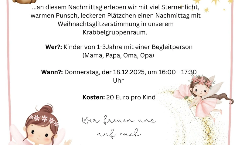 Das Programm findet für Kinder im Alter von 1-3 Jahren am 18.12.2025 von 16.00 Uhr-17.30 Uhr auf unserem Hof statt. Jedes Kind kann eine erwachsene Begleitperson mitbringen. Für die erwachsene Begleitperson wird kein wieteres Ticket benötigt.