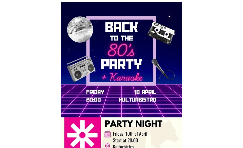 It's party time! Join us at the Kulturbistro for an epic 80s themed party night with karaoke. Think Madonna, ABBA, neon & glitter – so dress up and bring your friends for a night full of throwback vibes!