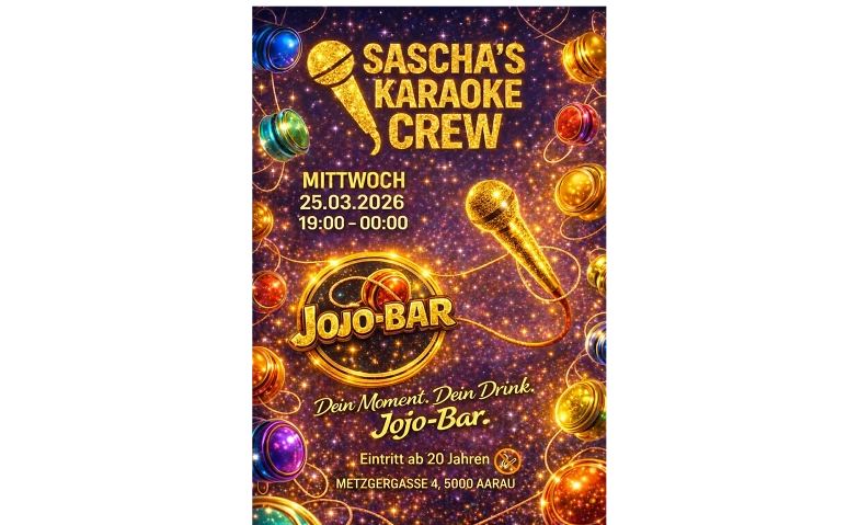 Am Mittwoch, 25.03.2026 sorgt Sascha’s Karaoke Crew fΓΌr beste Stimmung in der Jojo-Bar – einer der besten und beliebtesten Locations in Aarau.
