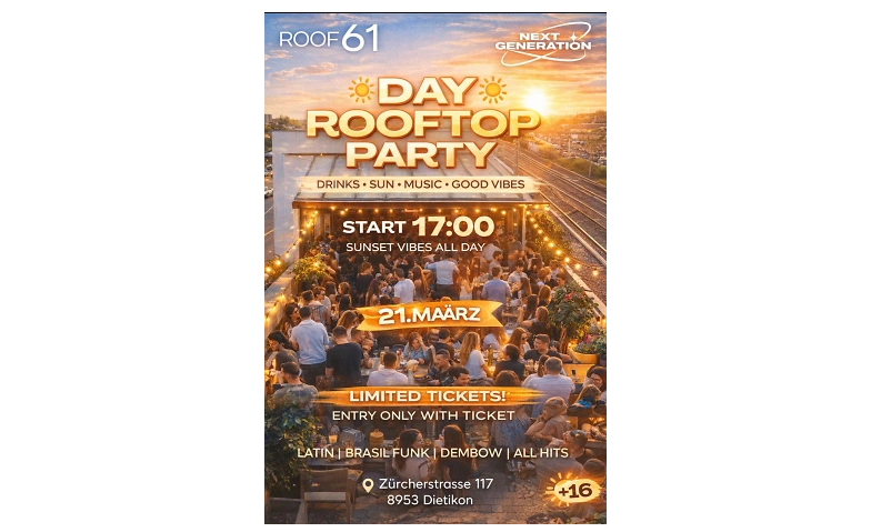 ALLE TICKETS FÜR AM ABEND SIND AUSVERKAUFT. Deswegen machen wir am Tag auch ein EVENT wegen der grosse nachfrage. Feiere die erste Nextgeneration Rooftop Dayparty in Dietikon ZH am Samstag, 21. März! Von 17:00 bis 21:15 Uhr erwartet dich die grösste +16-Party auf einem einzigartigen Dach mit den besten DJs, die Latin, Brasilfunk, Dembow und All Hits auflegen.