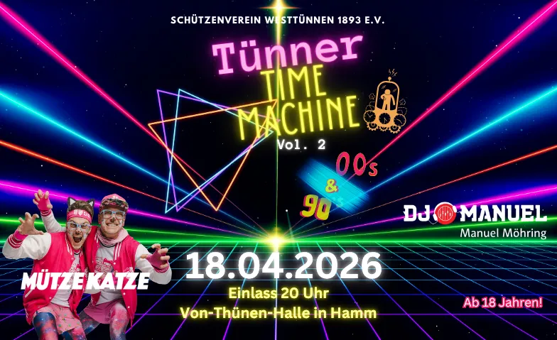 Am 18.04.2026 geht die Zeitreise weiter! Die Tünner Time Machine startet ihre zweite Auflage und macht diesmal Halt in den legendären 90er- und 2000er-Jahren. Die Von-Thünen-Halle verwandelt sich wieder in eine Partyzone, in der Nostalgie, Stimmung und Eskalation garantiert sind!
