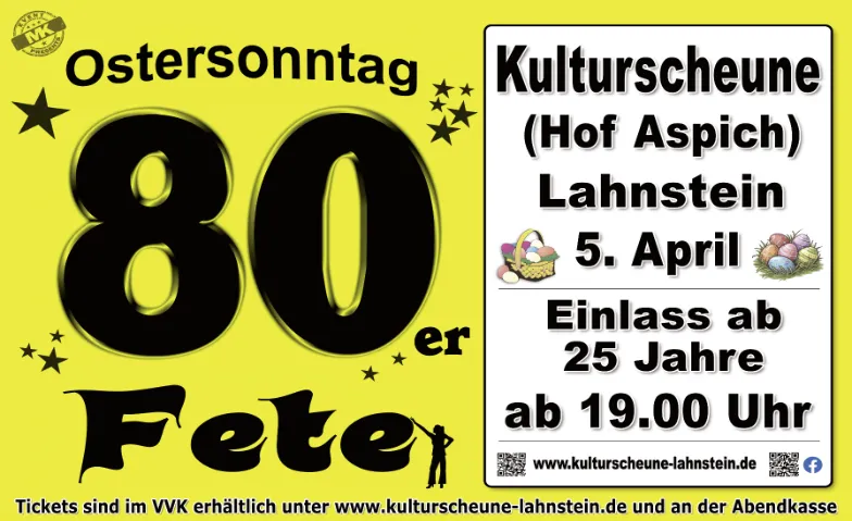 am Ostersonntag ab 20 Uhr in der Kulturscheune auf dem Hof Aspich in Lahnstein die ultimative 80er Fete.