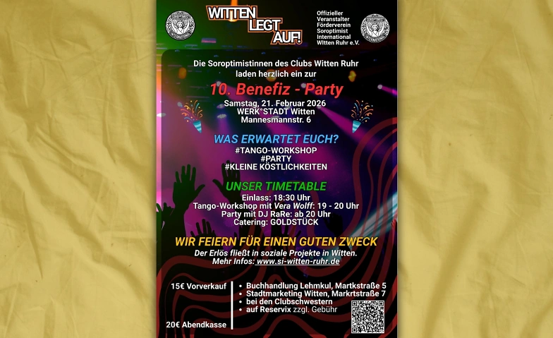 Am 21. Februar 2026 laden die Soroptimistinnen des Clubs Witten Ruhr herzlich zur 10. Benefiz-Party in die WERK°STADT ein. Die Gäste erwartet an diesem Abend ein abwechslungsreiches Programm. Los geht es um 19:00 Uhr mit einem Tango Workshop mit Vera Wolff. Hier könnt ihr euch der Musik voll und ganz hingeben. Ab 20:00 Uhr startet dann die Party mit DJ RaRe, der eure Beine zum Tanzen bringen wird. Zudem wird es kleine Köstlichkeiten vom Catering GOLDSTÜCK geben, die für das leibliche Wohl an diesem Abend sorgen.