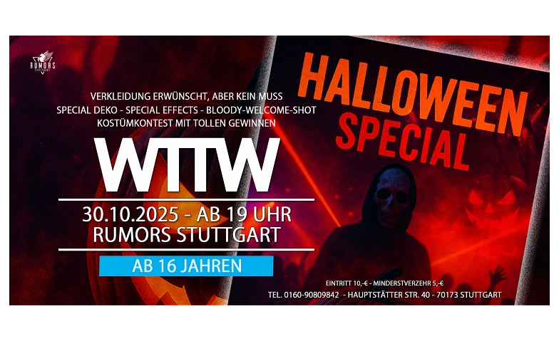 👻 Endlich – nach genau 362 Tagen ist es wieder soweit. Stuttgarts bekannteste Halloween-Party ab 16 präsentiert von WTTW@Rumors wird das gruselige Wochenende einläuten!