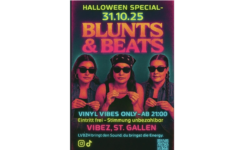 Blunts & Beats – Halloween Special @ Vibez, St. Gallen 📅 Donnerstag, 31. Oktober 2024 | 🕘 Djs: 21:00 Uhr | 📍 Vibez, Brühlgasse 19, St. Gallen | 🎟 Eintritt frei