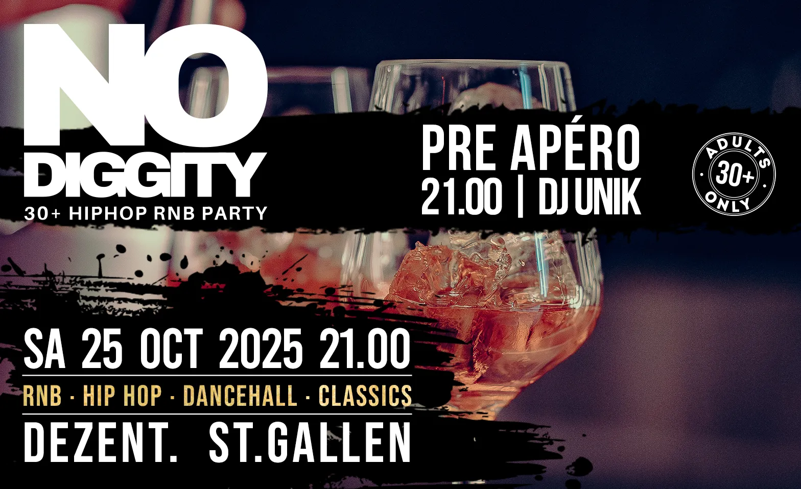 Die Ü30 Hip Hop & RnB Party NO DIGGITY kehrt zurück am 25. Oktober 2025 im Dezent. Club St.Gallen!