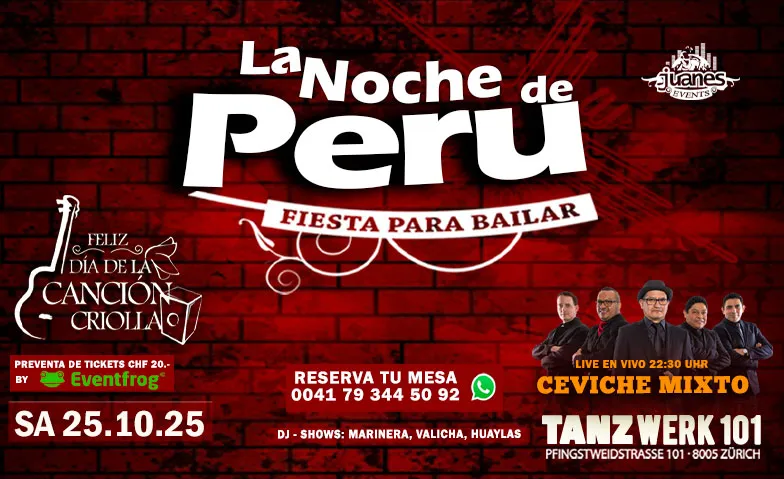 Bienvenidos a todos nuestros compatriotas Peruanos y amigos residentes en Suiza AL DIA DE LA CANCIÓN CRIOLLA 2025 en TANZWERK 101 un ambiente puramente Peruano, la mejor música, DJs, Shows, Banda en Vivo y la mejor Gastronomía.