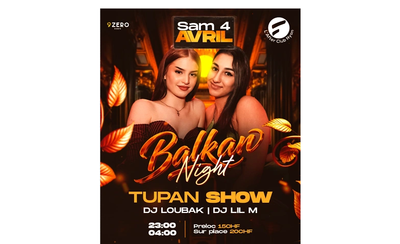 C'est du sérieux!! C'est confirmé!! La première soirée des Balkans sur la région de la Côte (Nyon), l'ambiance sera au plus HAUT niveau. Vous aurez le droit à un SHOW EXCEPTIONNEL de TUPAN et de songs phares des Balkans mixés par le Dj montant LOUBAK et Dj Lil M et son équipe au sein de l'After Club, un acceuillant et chaleureux. Les Balkans, une époque qu'on ne peut pas oublier.