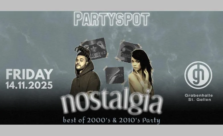 Die NOSTALGIA-Party geht in die nächste Runde. Nach einer unvergesslichen ersten Ausgabe bringt Partyspot die legendäre 2000er-/2010er-Sause erneut in die Grabenhalle.   Wir nehmen dich wieder mit auf eine musikalische Zeitreise voller Hits der letzten 25 Jahre, die deine Jugend geprägt haben - die Banger, bei denen du ausgeflippt bist und die Hymnen, die du heute noch laut mitsingst! Erlebe eine Nacht mit Songs von Lady Gaga, Bruno Mars, David Guetta und vielen mehr. Lass uns gemeinsam in Erinnerungen schwelgen, tanzen und feiern - denn manchmal war früher einfach alles besser! [gallery columns="4" ids="eyJ1cmwiOiJodHRwczpcL1wvd3d3LmdyYWJlbmhhbGxlLmNoXC93cC1jb250ZW50XC91cGxvYWRzXC8yMDI1XC8wOVwvMjAyNV8xMV8xNF9Ob3N0YWxnaWFfZmx5ZXIuanBnIiwidGl0bGUiOiIyMDI1XzExXzE0X05vc3RhbGdpYV9mbHllciIsImNhcHRpb24iOiIiLCJhbHQiOiIiLCJkZXNjcmlwdGlvbiI6IiJ9"]