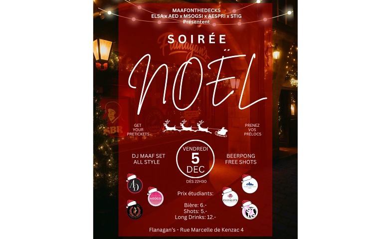 Cette fois, AED, ELSA, MSOGSI, AESPRI et la STIG s’unissent pour une dernière fête avant les vacances et les examens… et ça se passe au Flanagan’s, le vendredi 5 décembre dès 22h30 ! 🍻🎅