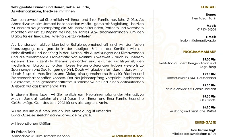 In diesem Sinne laden wir Sie herzlich zum Neujahrsempfang der Ahmadiyya