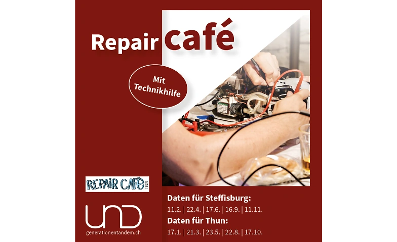 Im Rathaus Thun findet regelmässig ein Repair Café statt. Freiwillige des RepairCafé Thun sowie Technikhelfer:innen von UND Generationentandem unterstützen dich dabei, defekte Gegenstände gemeinsam zu reparieren. Die Veranstaltungen fördern nachhaltiges Handeln, sparen Ressourcen und bieten Raum für Begegnungen bei Kaffee oder einem Getränk.