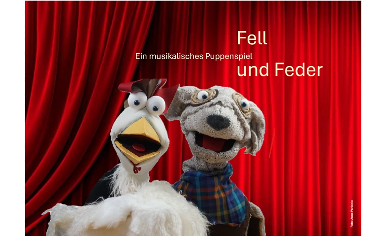 DerHundist ganz aus dem Häuschen, und auch das Huhnhat Lampenfieber: Gleich geht’s los, die Vorstellung beginnt! Hundund Huhn werden ihre Geschichte aufführen, und die geht so: Eindavongelaufener Hund sucht einen Freund.Und er weiss auch schon genau, wie der sein sollte: Gross, stark undzu allen Abenteuern bereit. Ein Wunschbusch soll ihm einen solchenherzaubern. Doch was springt aus dem Gebüsch hervor? Ein ausgebüxtesHuhn! Das von einem Piratenschatzträumt... Nicht gerade das, was der Hund sich vorgestellt hatte.Aber immerhin: Das Huhn möchte ihm helfen, einen Freund zu finden.Auf der Suche nach der Erfüllung ihrer Wünsche spüren die beidenmehr und mehr, dass das grösste Glück in ihrer gemeinsamenFreundschaft liegt. Ende! Applaus! Huhn und Hund sind glücklich,dass ihnen die Vorstellung gelungen ist.Diereizende Geschichte über Freundschaftvon Lorenz Pauli ist gleichzeitig eine Liebeserklärung ans Theater,das manchmal wie das echte Leben ist. Und umgekehrt.CharlottePerrey und Rodolphe Schacher haben «Fell und Feder» kindgerecht fürgrosses Orchester, Bariton und Sopran im Auftrag des ArgoviaSinfonieorchesters vertont. Wirspielen die Oper im Kleinformat als Figurenspiel mit zweiSängern/Puppenspielern, Akkordeon und Harfe. Damit produziert derVerein Stimmen zu Gast von Grund auf