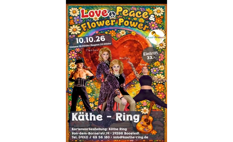 „Love, Peace & Flower Power“ ist eine mitreißende Travestieshow, die den Spirit dieser Epoche feiert – eine Zeit, in der Liebe alles verändern konnte, Musik Herzen öffnete und Freiheit das größte Versprechen war.