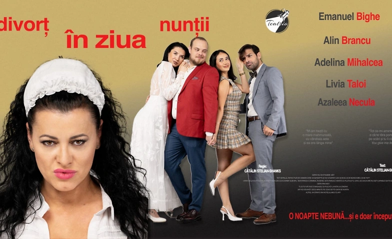Cătălin și Petra aduc la Zürich spectacolul „Divorț în Ziua Nunții”, interpretat de cinci actori extraordinari, cunoscuți pentru energia lor și jocul scenic impecabil: