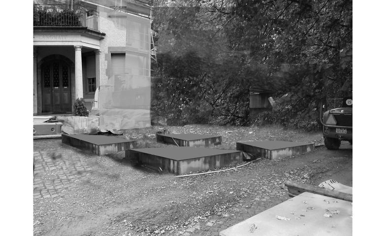 Mit bemerkenswertem Spürsinn öffnet Reto Boller in seiner neuen Arbeit eine überraschende Sicht auf das alte, kunsthistorische Thema des Sockels. Vier tonnenschwere Kransockel aus Beton verwandeln sich vor dem Haupteingang der Langmatt als Readymades in eine vielstimmige Intervention. Während eines kurzen Zeitfensters nach der Demontage des Baukrans und vor dem Abtransport der Sockel stellen sich hintergründige Fragen, ohne dass hierfür etwas neu gebaut oder umgebaut werden musste, insofern relevant, da Beton als bedenklicher CO2-Auslöser gilt.