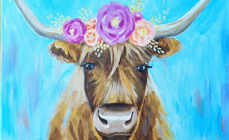 Farbenprächtig umgesetzt in einer semi-realistischen Malweise, die zwischen naturalistischer Darstellung und expressiver Farbsetzung pendelt. Die kompakte Form des Hochlandrinds wird durch verschiedene kräftige Pinselstriche modelliert.
