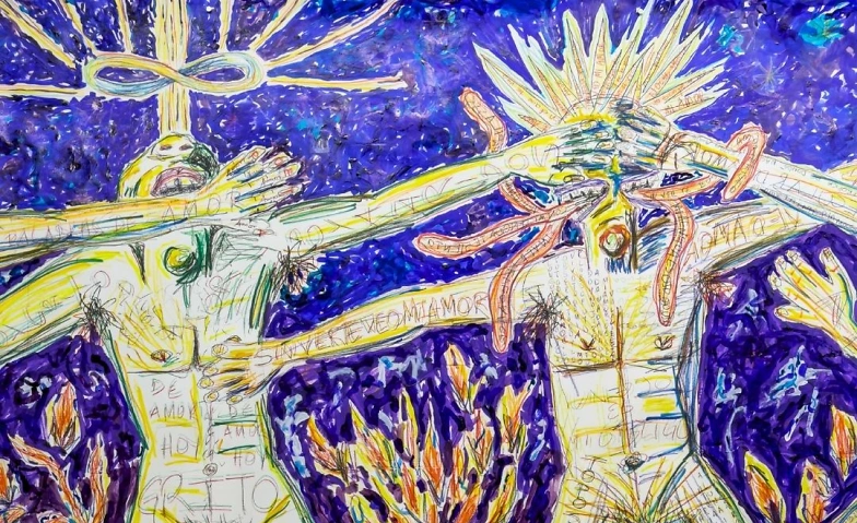 Following the mattress, Lucas moved on to create large-format works on paper, which serve as vivid, dynamic canvases. In Lucas Goubert’s practice, poetry and writing come first; the visual elements always derive from his words. The words are embedded within the compositions, vibrantly weaving through the anthropomorphized shadow lines, chaotic energy, rough brush strokes—almost brutal in their intensity—and nervously sketched forms that seem to pulse with urgent life. The words breathe and scream across the paper, infusing the work with raw emotion and visceral energy. From the start of his artistic journey—initially marked by spontaneous sketches inspired by poets like Mistral, Lorca, and Whitman—Lucas’s art has blossomed into a language full of archetypal figures—mystics, surreal creatures, and mythic beings—living passionately in their worlds, unfiltered and authentic. Using a palette of collage, oils, inks, and waxed crayons, he conjures scenes pulsating with Latin American magic realism, Jungian archetypes, Lovecraftian shadows, punk’s untamed spirit, Basquiatian naivety, and Chopinian Romanticism.