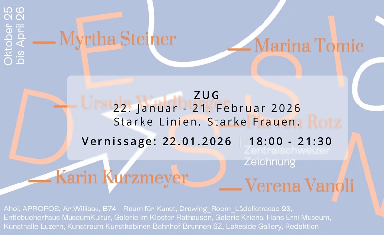 Mit „Starke Linien. Starke Frauen.“ zeigt die Lakeside Gallery im Rahmen der DESSIN-Reihe eine Ausstellung, die Zeichnung als Haltung versteht: als Spur, als Verdichtung, als mutige Setzung. Verena Vanoli, Marina Tomic, Karin Kurzmeyer, Pia von Rotz, Myrtha Steiner und Ursula Waldburger – sechs Künstlerinnen aus unterschiedlichen Generationen und mit sehr eigenständigen Handschriften – verhandeln, wie Linie heute gedacht werden kann: vom feinsten, beinahe verschwindenden Grafit bis zur raumgreifenden Fadenzeichnung, vom poetischen Fragment bis zur körperlich aufgeladenen Geste.