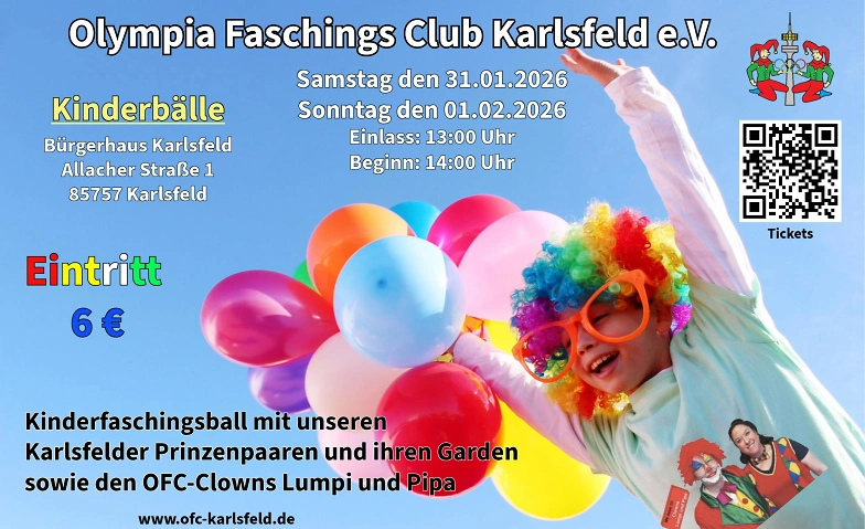 Der Olympia-Faschings-Club Kalrsfeld bei München e.V. lädt ein zum Kinderfaschingsball mit unseren Karlsfelder Prinzenpaaren und ihren Garden sowie den OFC-Clowns Lumpi und Pipa