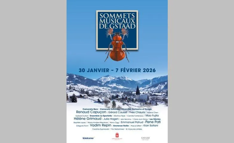 Januar – Saanen W. A. Mozart: Concertone für zwei Violinen und Orchester C‑Dur KV 190 W. A. Mozart: Sinfonia concertante für Violine, Viola und Orchester Es‑Dur KV 364/320a Januar – Gstaad / Saanen J. Brahms: Sonate für Violine und Klavier Nr. 2 A‑Dur op. 100 Yves Chauris: Bleu sur bleu (Festivalauftrag) R. Strauss: Sonate für Violine und Klavier Es‑Dur op. 18 E. Bloch: Avodah G. Bacewicz: Konzert für Streichorchester C. P. E. Bach: Konzert d‑Moll Wq 22 H. M. Górecki: Drei Stücke im alten Stil für Streichorchester J. S. Bach: Suite Nr. 2 h‑Moll BWV 1067 Februar – Rougemont G. Durliat: Improvisation I über Bach J. S. Bach: Ricercare a 6 aus dem Musikalischen Opfer BWV 1079 G. Durliat: Improvisation II über Bach J. S. Bach / F. Liszt: Fantasie und Fuge g‑Moll BWV 542 G. Durliat: Improvisation III über Bach J. S. Bach / G. Durliat: Die Kunst der Fuge, Contrapunctus XIV (In memoriam) J. S. Bach / M. Hess: Jesus bleibet meine Freude D. Schostakowitsch: Klaviertrio Nr. 1 c‑Moll op. 8 P. I. Tschaikowski: Klaviertrio a‑Moll op. 50 „À la mémoire d’un grand artiste“ Februar – Gstaad / Rougemont A. Pärt: Fratres für Violine und Klavier L. van Beethoven: Sonate für Violine und Klavier Nr. 1 D‑Dur op. 12 Nr. 1 Yves Chauris: Bleu sur bleu (Festivalauftrag) H. Wieniawski: Variationen über ein Originalthema op. 15 L. van Beethoven: Klaviersonate Nr. 1 f‑Moll op. 2 Nr. 1 R. Wagner: Albumblatt WWV 94 A. Berg: Zwölf Variationen über ein Originalthema J. Brahms: Sonate Nr. 1 G‑Dur op. 78 R. Wagner / F. Liszt: Isoldes Liebestod aus Tristan und Isolde Februar – Saanen / Gstaad / Rougemont „Pastorale‑Symphonie von Beethoven – Eine farbige Symphonie über die Schönheit der Natur und der Tiere“ (nach L. van Beethoven, Sinfonie Nr. 6 F‑Dur op. 68) M. Ravel: Sonate Nr. 2 für Violine und Klavier G‑Dur E. Ysaÿe: Poème élégiaque d‑Moll op. 12 für Violine und Klavier Yves Chauris: Bleu sur bleu (Festivalauftrag) F. Poulenc: Sonate für Violine und Klavier F. Mendelssohn / J. S. Bach: „Konversation zweier Komponisten über den Sinn des Lebens“ (Programm mit Werken von Mendelssohn und Bach) Februar – Gstaad / Rougemont W. Lutosławski: Subito für Violine und Klavier S. Prokofjew: Sonate für Violine und Klavier Nr. 2 D‑Dur op. 94a Yves Chauris: Bleu sur bleu (Festivalauftrag) O. Messiaen: Thème et Variations für Violine und Klavier M. Ravel: Sonate Nr. 2 für Violine und Klavier G‑Dur M. Ravel: Klaviertrio a‑Moll G. Fauré: Klavierquartett Nr. 2 g‑Moll op. 45 Februar – Gstaad / Saanen T. Takemitsu: Distance de Fée O. Messiaen: Fantaisie für Violine und Klavier L. Boulanger: Deux morceaux für Violine und Klavier C. Franck: Sonate A‑Dur für Klavier und Violine FWV 8 A. Pärt: Fratres für Violine und Klavier R. Schumann: Fantasiestücke op. 73 R. Schumann: Sonate für Violine und Klavier Nr. 1 a‑Moll op. 105 C. Debussy: Sonate Nr. 3 für Violine und Klavier g‑Moll M. Ravel: Sonate Nr. 2 für Violine und Klavier G‑Dur Februar – Gstaad / Saanen K. Szymanowski: Sonate für Violine und Klavier d‑Moll op. 9 Yves Chauris: Bleu sur bleu (Festivalauftrag) F. Poulenc: Sonate für Violine und Klavier FP 119 C. Saint‑Saëns / E. Ysaÿe: Caprice nach der Etüde in Walzerform op. 52 für Violine und Klavier W. A. Mozart: Sinfonie Nr. 21 A‑Dur KV 134 L. Boccherini: Sonate für zwei Violoncelli C‑Dur G 17 L. Boccherini: Konzert für Violoncello D‑Dur G 479 W. A. Mozart: Sinfonie Nr. 27 G‑Dur KV 199 Februar – Gstaad / Saanen W. A. Mozart: Sonate für Klavier und Violine G‑Dur KV 301 Yves Chauris: Bleu sur bleu (Festivalauftrag) S. Prokofjew: Sonate für Violine und Klavier Nr. 2 D‑Dur op. 94a M. Ravel: Tzigane M. Ravel: Ma Mère l’Oye I. Strawinsky: Konzert Es‑Dur „Dumbarton Oaks“ H. Duparc: Sérénade florentine; Chanson triste; L’Invitation au voyage; Au pays où se fait la guerre; Le Manoir de Rosemonde G. Bizet: „La fleur que tu m’avais jetée“ (Arie aus Carmen); „Je crois entendre encore“ (Arie aus Die Perlenfischer) Ensemble: Sommets Musicaux de Gstaad - Das erste grosse Klassikfestival des Winters 2026 Die Exzellenz der klassischen Musik im Herzen der Berner Alpen: eine Woche aussergewöhnlicher Konzerte in Gstaad mit grossen Orchestern, renommierten Solistinnen und Solisten sowie 14 jungen Solistinnen und Solisten. Die Sommets Musicaux de Gstaad präsentieren vom 30. Januar bis 7. Februar 2026 ihre 26. Ausgabe, die ganz im Zeichen der Violine steht. Neun Festivaltage bringen junge Talente und international renommierte Künstler in der Kapelle von Gstaad sowie in den Kirchen von Saanen und Rougemont zusammen. Drei Konzertreihen strukturieren das Festival: Nachmittags treten sieben ausgewählte junge Geigerinnen und Geiger in der Kapelle auf, abends in Saanen grosse Stars und in Rougemont die Favoriten von Renaud Capuçon, dessen Mentor 2026 Vadim Repin ist. Composer‑in‑Residence Yves Chauris steuert das Auftragswerk „Bleu sur bleu“ bei; zu den Höhepunkten zählen Konzerte mit Emmanuel Pahud und Camerata Bern, Clara‑Jumi Kang und dem Chamber Orchestra of Europe, Hélène Grimaud, Kian Soltani sowie Pene Pati und Les Siècles. Die Sommets Musicaux de Gstaad präsentieren vom 30. Januar bis 7. Februar 2026 ihre 26. Ausgabe, die ganz im Zeichen der Violine steht. Neun Festivaltage bringen junge Talente und international renommierte Künstler in der Kapelle von Gstaad sowie in den Kirchen von Saanen und Rougemont zusammen; das Festival verbindet seit 2001 Vermittlung, Exzellenz und Entdeckung. Zentraler Bestandteil bleiben die drei Konzertreihen an drei besonderen Orten: Nachmittags bieten sieben ausgewählte junge Geigerinnen und Geiger in der Kapelle von Gstaad ein Podium, abends treten in Saanen die grossen Stars des Festivals auf, während in Rougemont die persönlichen Favoriten des künstlerischen Leiters in intimen Recitals zu erleben sind. Mentor der eingeladenen Nachw