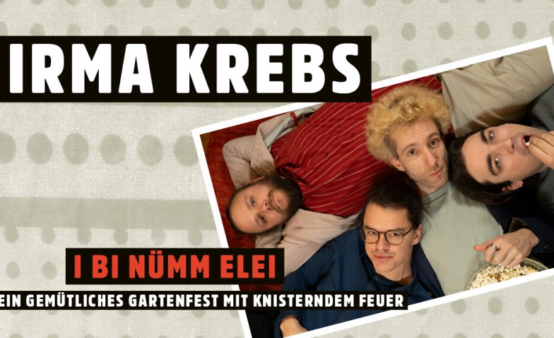 Irma Krebs präsentieren ihr viertes Mundartalbum: I bi nümm elei Mit dem neuen Programm entfernen sich die vier Berner von ihrem bisherigen, legendär schrägen Gerumpel und begehen klanglich wie inhaltlich neue Pfade in Richtung einer Ruhe und Feinfühligkeit, eines Trostes in dunklen Tagen und der Atmosphäre eines gemütlichen Gartenfestes mit knisterndem Feuer. Luka Mandic (git, p), Michael Nejedly (voc, git, p), Tobias Schmid (dr) und Bidu Rüegsegger (b) spielen, sich lustvoll an Folk, Pop, Rock und Americana orientierend, augenzwinkernde und herzerwärmende Lieder über die grossen und kleinen Freuden und Leiden des Alltags, des Ankommens im Leben und der Liebe. Berner Mundart zum Schmunzeln und Schunkeln. Also ideal zum Tanzen und Trinken, zusammen und gleichzeitig!