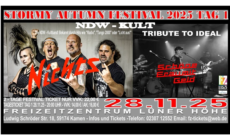 Feiert mit uns eine tolle NDW-Party! Schmeißt Euch noch einmal in Euren neonbunten 80er-Look und singt noch einmal lauthals mit, wenn es heißt „Deine blauen Augen machen mich so sentimental!“ Die Hits von „NICHTS“ und „IDEAL“ sind nach all den Jahren immer noch echte Ohrwürmer! Am Freitag, den 28.11.2025 um 19:30 Uhr bietet das Team des Freizeitzentrums Lüner Höhe wieder ein tolles Konzert für Fans von handgemachter Rockmusik an. Zum Auftakt des Stormy Autumn Festivals im Freizeitzentrum dreht sich alles um die Neue Deutsche Welle, die Anfnag der 80er Jahre über das Land schwappte und zahlreiche Bands und Hits zum Vorschein brachte. Los geht es um 20:00 Uhr mit der Ideal-Tribute Band