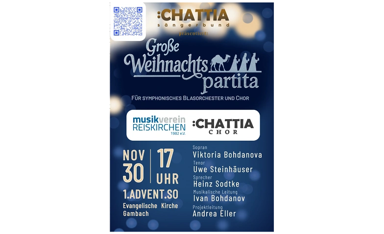 Der “Chattia Chor“ des Chattia Sängerbundes präsentiert in Kooperation mit dem Musikverein Reiskirchen die „Große Weihnachtspartita“ von Alfred Bösendorfer und lädt SIE herzlich zu diesem festlichen Konzert ein. 60 Sängerinnen und Sänger sowie 50 Musiker bereiten sich derzeit auf dieses Weihnachtskonzert vor. Man möchte mit der klingenden Weihnachtsgeschichte, für Blasorchester, Chor und professionellen Erzähler auf die bevorstehende Adventszeit und Weihnachten einstimmen.
