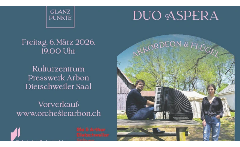Erleben Sie einen besonderen Abend mit dem Duo Aspera – einem einzigartigen Zusammenspiel der italienischen Pianistin Valentina Vargiu und des moldawischen Akkordeonisten Ghenadie Rotari. Die beiden Musiker sind der nächste Glanzpunt im Dietschweiler Saal.
