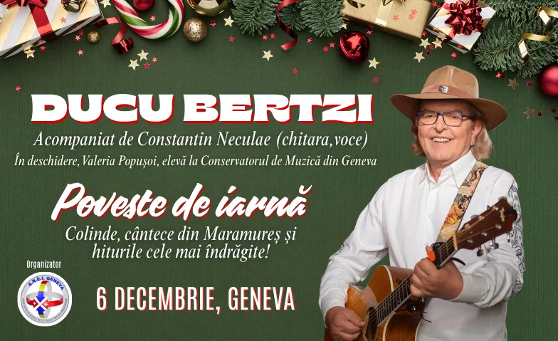 Nous vous invitons à un concert exceptionnel, « Conte d'hiver », donné par le célèbre artiste folk Ducu Bertzi, accompagné par le talentueux Constantin Neculae à la guitare et au chant. Préparez-vous à être transportés dans une atmosphère magique, pleine de chaleur et de tradition, à l'approche des fêtes de fin d'année. Profitez d'une soirée enchanteresse et pleine d'émotion où le cœur de la musique folk battra plus fort que jamais, aux côtés du légendaire Ducu Bertzi.