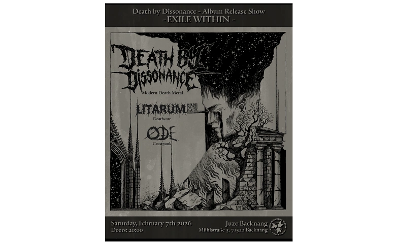 Nach Jahren voller Schweiß, Energie und kompromissloser Bühnenpräsenz schlägt die Stuttgarter Metalband DEATH BY DISSONANCE nun ein neues Kapitel auf: Mit der Veröffentlichung ihres neuen Albums EXILE WITHIN, lädt die Band voller Stolz dazu ein, gemeinsam ihr neues Werk zu zelebrieren.