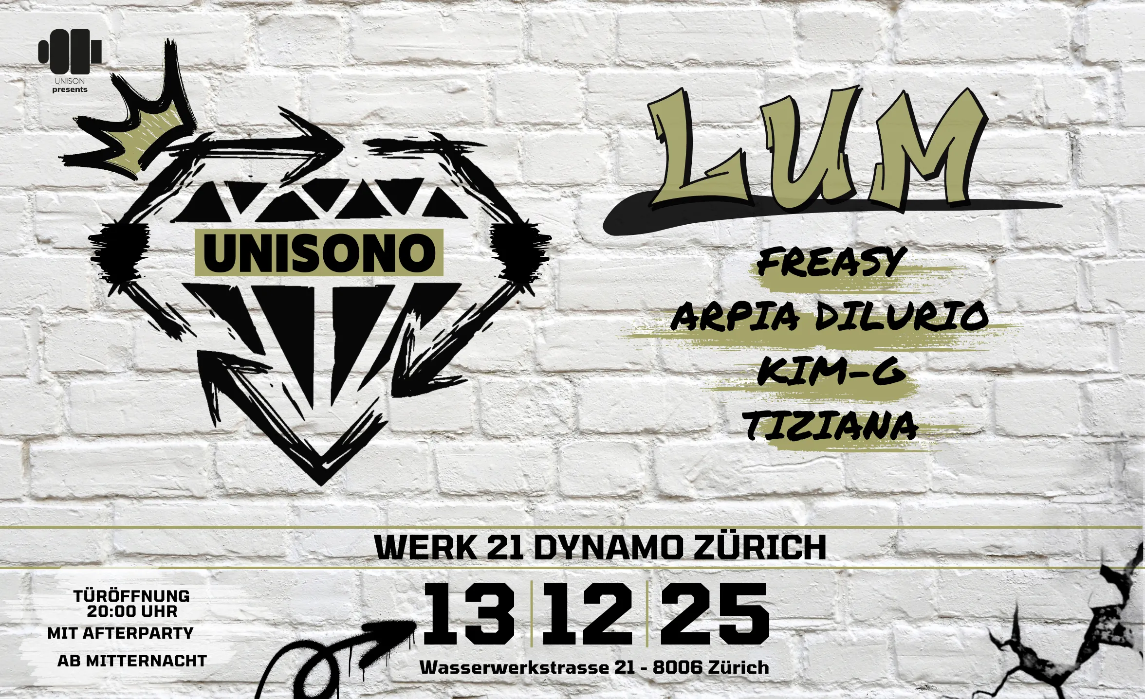 Headliner des Abends ist LUM, begleitet von den einzigartigen Acts aus dem Unison Collective selbst Arpia Dilurio, Freasy, Kim-G und Tiziana. Gemeinsam decken sie ein breites Spektrum ab – von Pop über Hip-Hop bis hin zu elektronischen Vibes, sowie Reggaeton.
